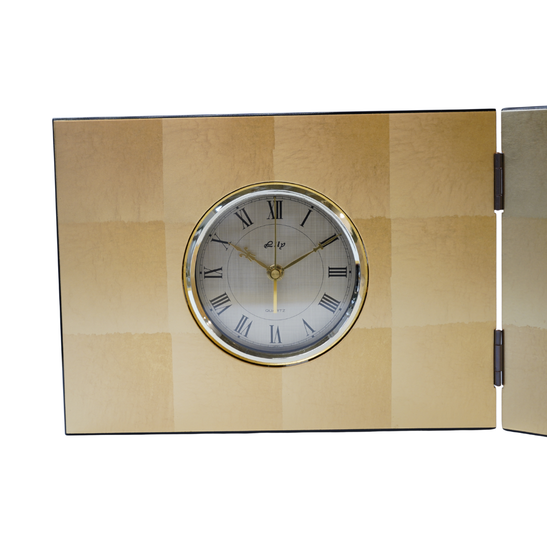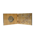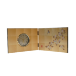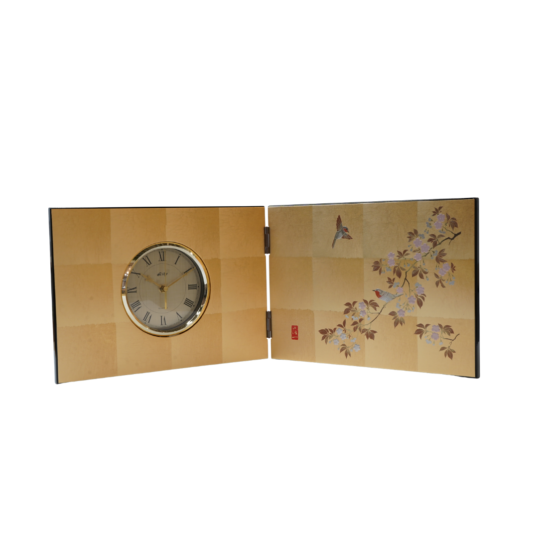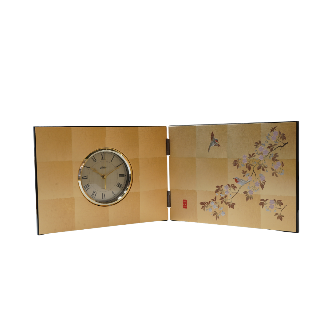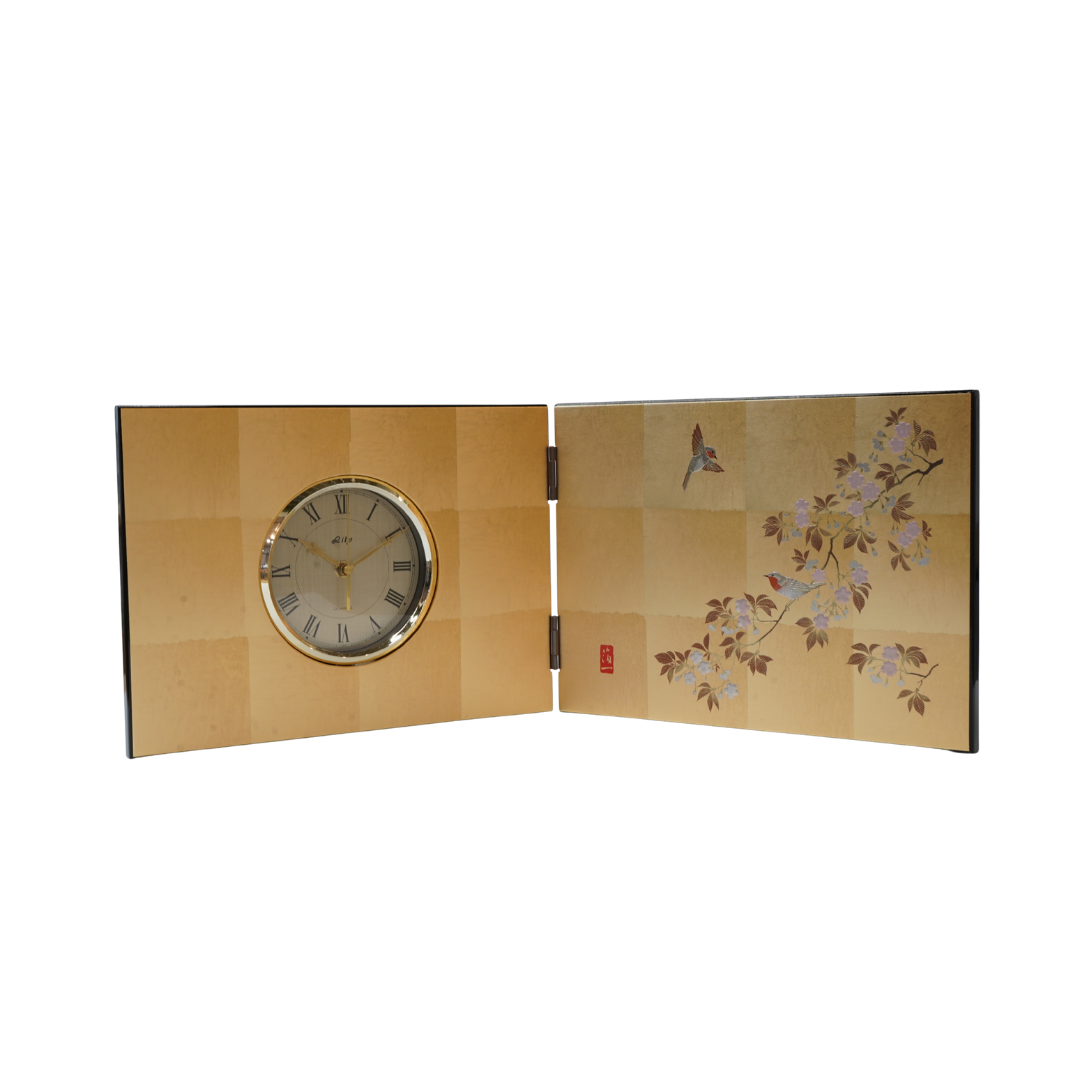 This folding screen clock expresses the traditional Japanese beauty of kachō-ga (flower-and-bird art) through the refined craftsmanship of Kanazawa gold leaf.