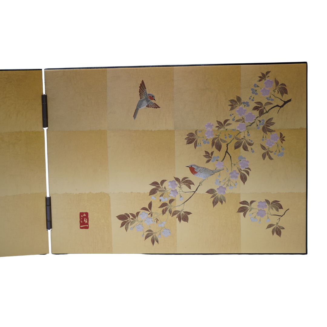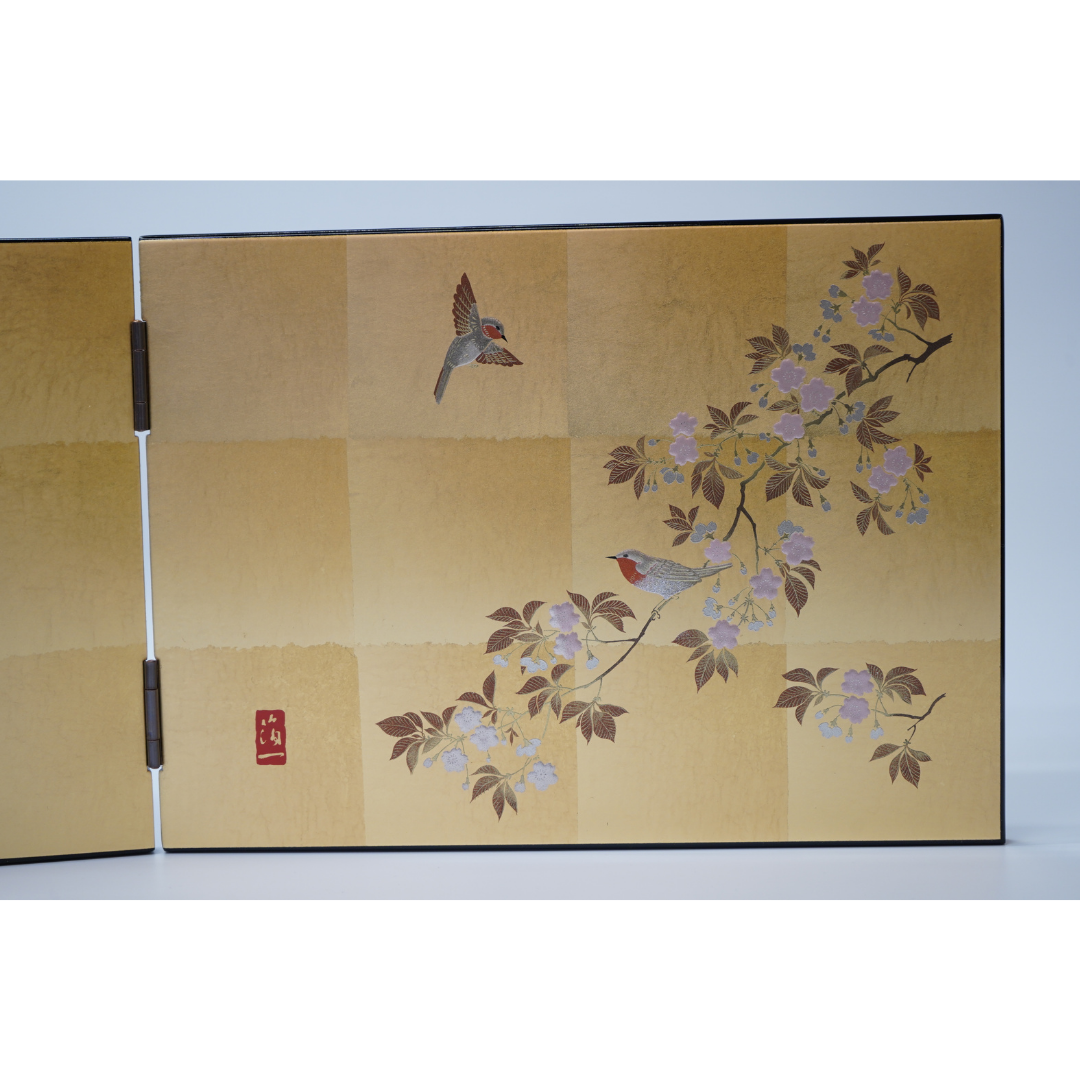 Based on works by Suzuki Kiitsu of the Edo Rinpa school, it depicts birds quietly perched among flowers.The background uses hand-torn Kanazawa gold leaf, while the birds and cherry blossoms feature the unique “rubbed foil embossing technique.”